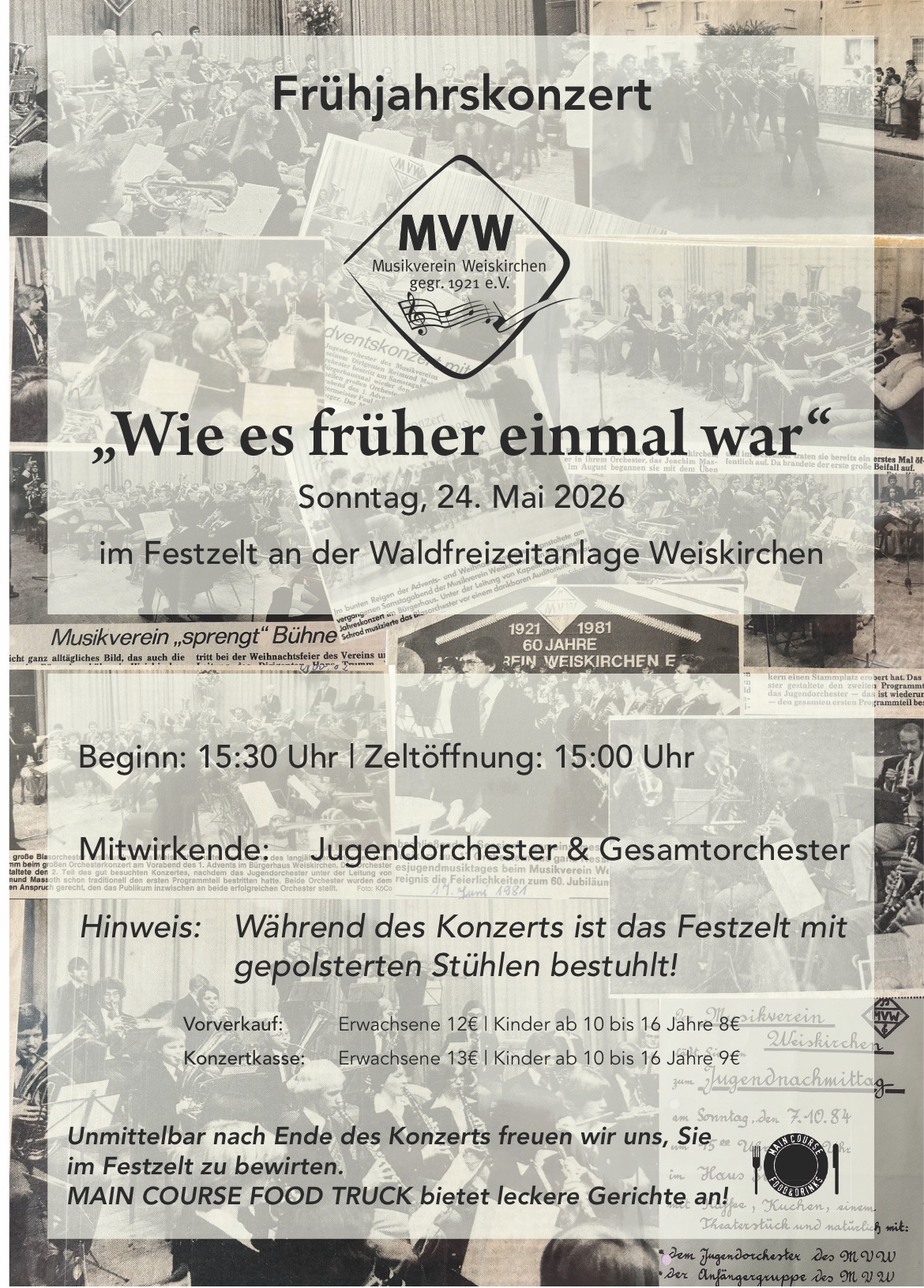 Der Musikverein Weiskirchen lädt am Pfingstsonntag, den 24. Mai 2026, herzlich zum diesjährigen Frühjahrskonzert im Rahmen des Jubiläumsfestes an der Waldfreizeitanlage in Weiskirchen ein. In diesem Jahr steht die Veranstaltung im Zeichen eines ganz besonderen Anlasses: 105 Jahre Musikverein Weiskirchen. Die Besucher dürfen sich auf einen abwechslungsreiches Konzert freuen.